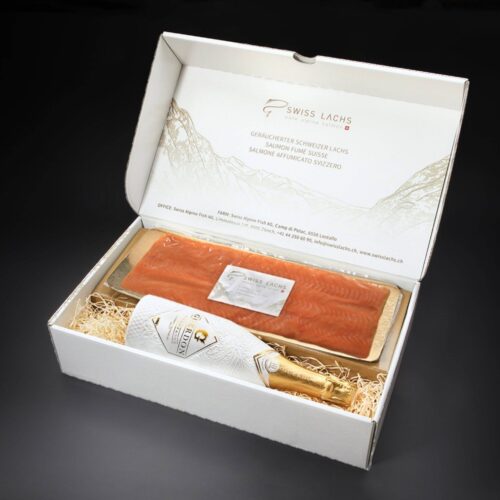 Fianco di salmone affumicato intero, 1’000g, con champagne Guerdon in confezione regalo